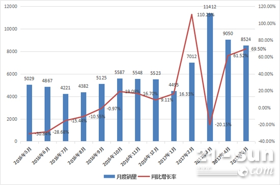 2017年5月,國內(nèi)25家主要裝載機(jī)生產(chǎn)企業(yè)合計(jì)銷售各類裝載機(jī)8524臺,同比去年5月份5029臺,大幅增長69.50%。最近8個(gè)月來,裝載機(jī)有7個(gè)月實(shí)現(xiàn)同比正增長(僅3月份下滑20%);今年1-5月份,裝載機(jī)累計(jì)銷量為40493臺,同比增長約26.06%,市場持續(xù)升溫。