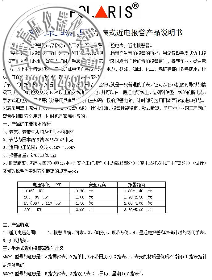 4.本品設(shè)計精巧,美觀實用,既可計時,也可為驗電防護(hù)之用;當(dāng)您戴上此表定讓你更加儒雅,更加安全。POLARIS 普萊瑞思