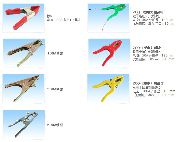 ZCQ系列測(cè)試鉗主要適用與測(cè)量接觸電阻,回路電阻等,是高壓斷路器,變壓器等產(chǎn)品的必備測(cè)試工具。測(cè)試鉗主要由鉗架,鉗口,彈簧,插孔等組成,鉗架采用高強(qiáng)度工程塑料壓鑄,鉗口采用銅板沖制成型。鉗口齒夾鋒利,能夠刺穿導(dǎo)體氧化層,圓弧形鉗口專(zhuān)用于高壓斷路器梅花觸頭的電阻測(cè)量??山娱L(zhǎng)線連接儀器,便于測(cè)量。